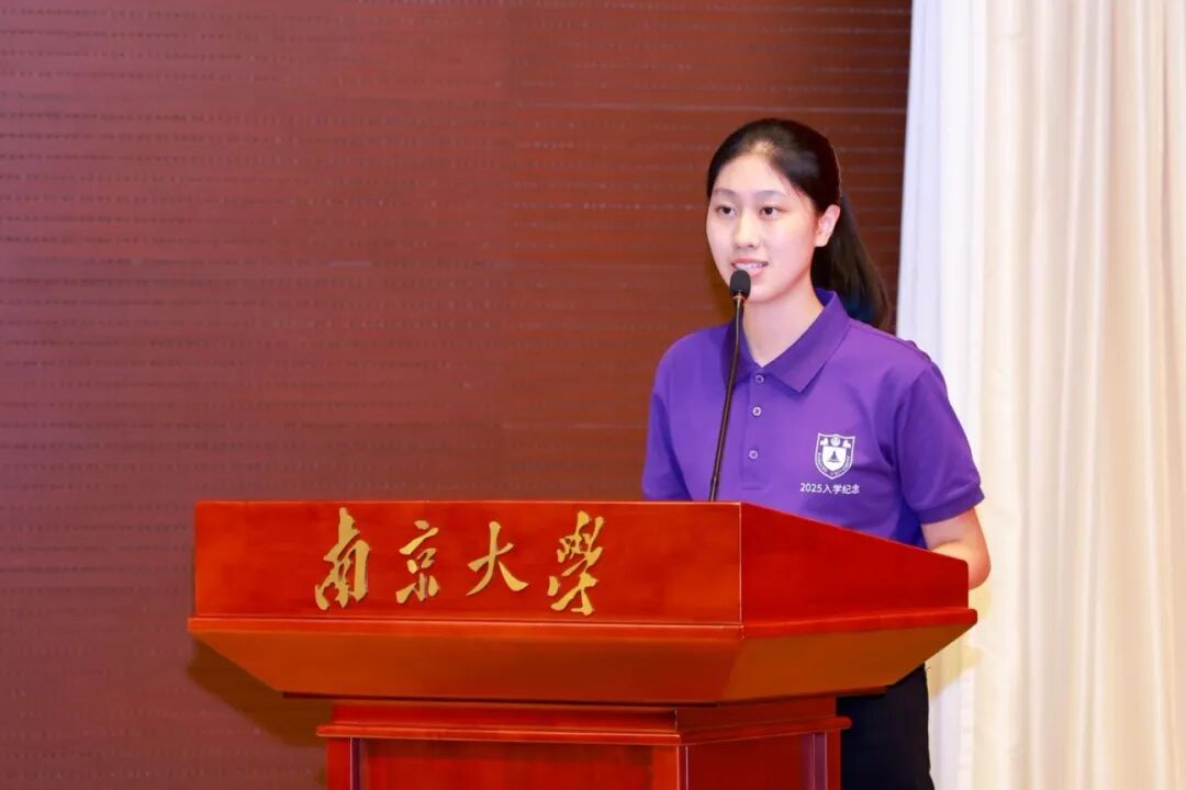 随后,新生代表们也表达了他们对崭新旅程的憧憬。本科生新生代表肖君一满怀对马克思主义理论的热忱,将其作为了高考填报的第一志愿。从初识南大深厚的历史底蕴到入学后感受到无微不至的人文关怀,她愈发确信,这里正是锤炼自我、追逐理想的沃土。在青春奋进的道路上,她呼吁全体新同学以“风雨兼程”之姿与南大同行,一道赓续文脉,勇担时代使命。