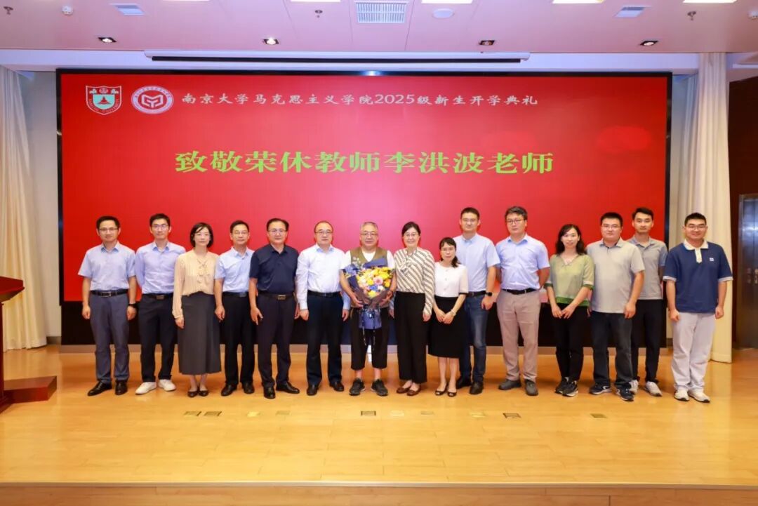 典礼进入温馨而庄重的荣休教师寄语环节。荣休教师李洪波老师讲述了自己与南大之间长达四十载的故事,并向同学们分享了“不强求,不放弃,常给心放假”的人生寄语。他强调,“不强求”是指要避免因不切实际的执着而自寻烦恼;“不放弃”则是说人不能因此躺平,同时仍需保持生活与工作的目标感,呼吁同学们要成为脚踏实地、言谈务实的高层次人才,并表达了对同学们学习与生活的美好祝愿。随后,在悠扬的音乐中,学生代表向李洪波老师献花,学院教师代表们与李洪波老师合影。